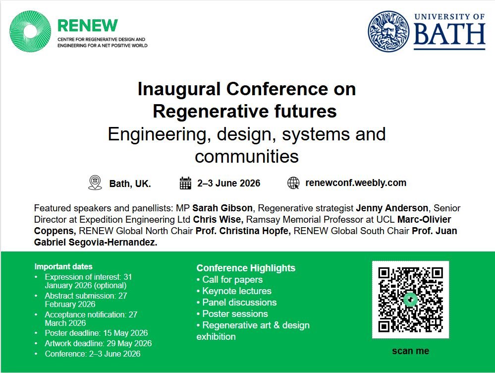 2026 is shaping up to be a landmark year for Regenerative Design, and this June in Bath, the Inaugural Conference on Regenerative Futures will bring together researchers and practitioners to explore, challenge, and advance regenerative thinking across engineering, design, systems, and communities.